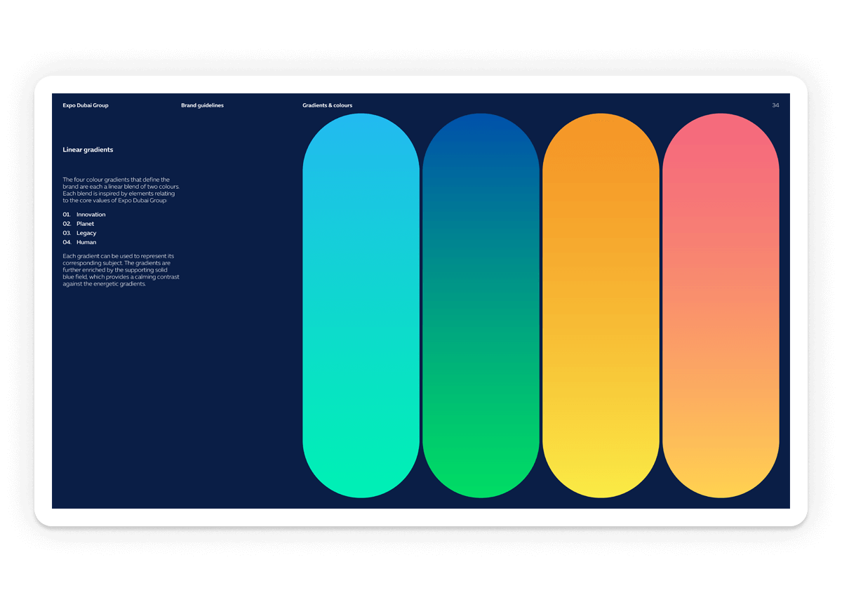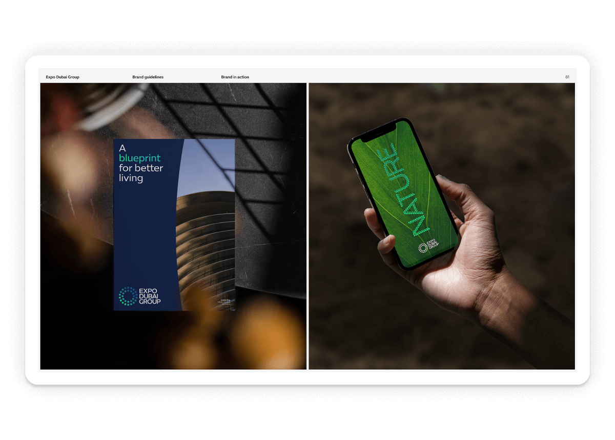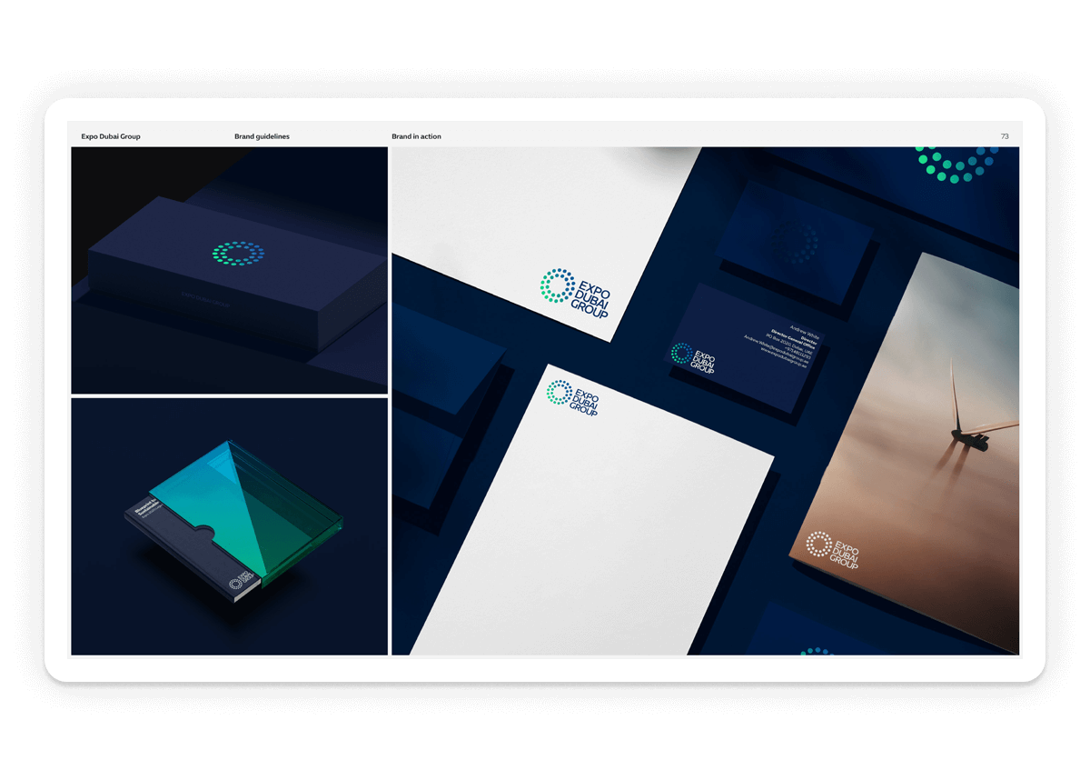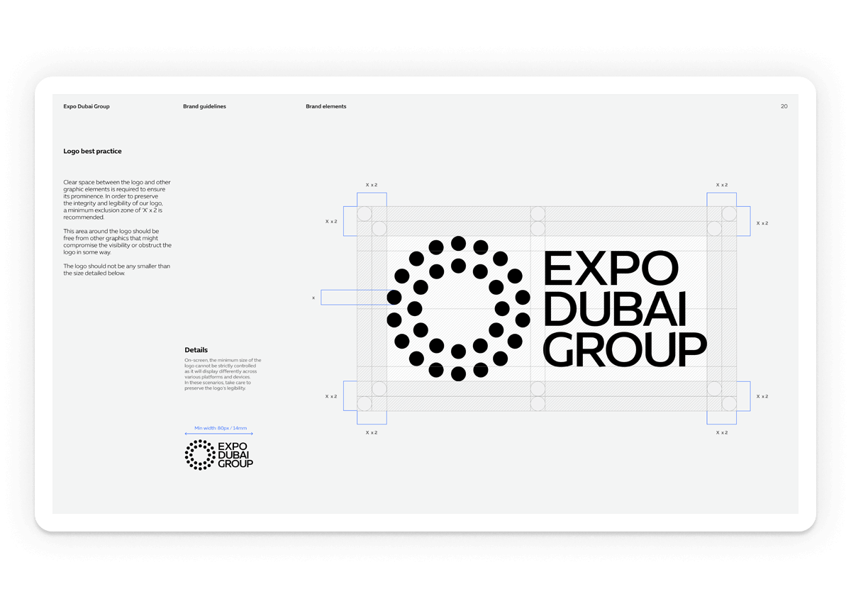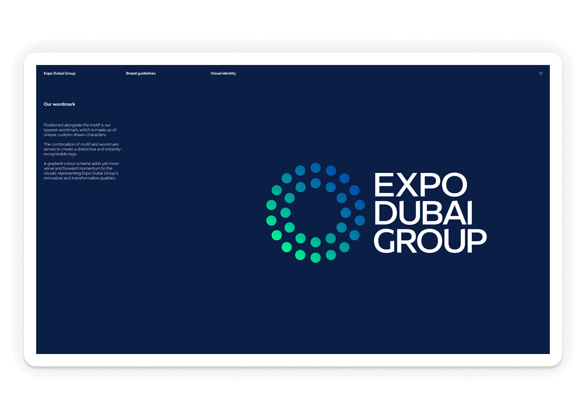 Branding, wordmark design and usage guidelines for Expo Dubai Group, established to preserve and harness Expo 2020 Dubai’s vast intangible legacy, for shared human progress.